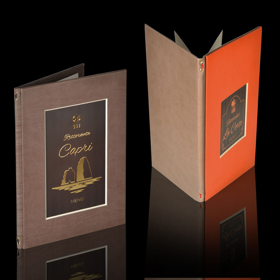 Menù elegante con cover in materiali pregiati, completamente personalizzabile nei colori, materiali e dimensioni per rispecchiare l’identità del locale.